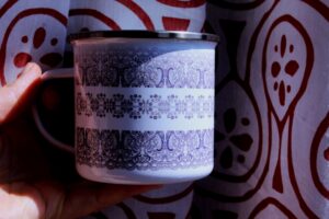 Smaltovaný hrneček plecháček s autorskými kresbami na motivy modrotisku, objem 0,3l